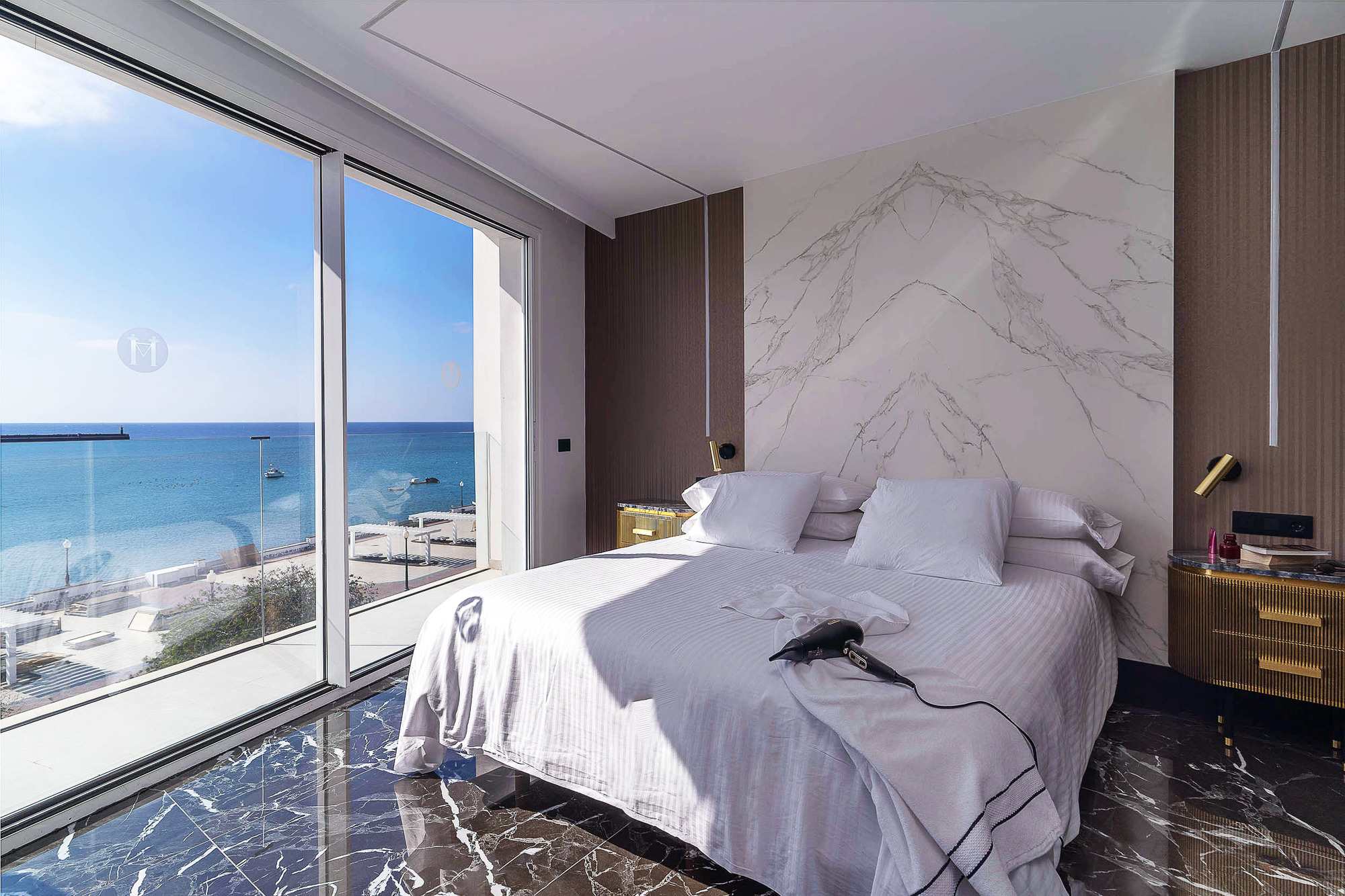 Impresionante suite de 1 dormitorio con baño abierto y vistas frontales al océano atlántico. Nuestra Grand Blue Ocean Suite representa lo que significa una estancia en Blue Marina Suites. Lujo, confort y cuidado hasta en el más mínimo detalle.